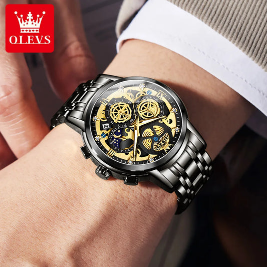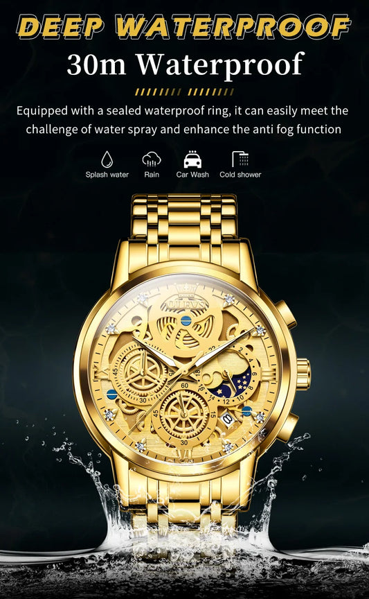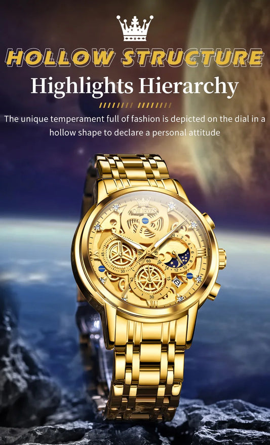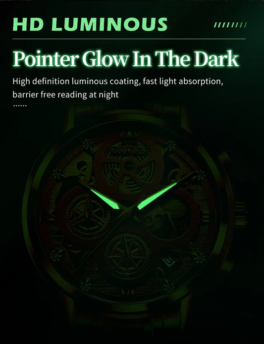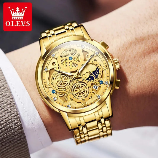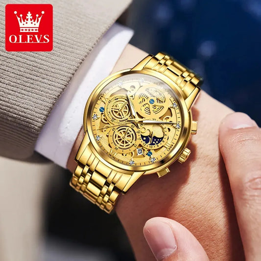 OLEVS Men's Watches Top Brand Luxury Original Waterproof Quartz Watch for Man Gold Skeleton Style 24 Hour Day Night New