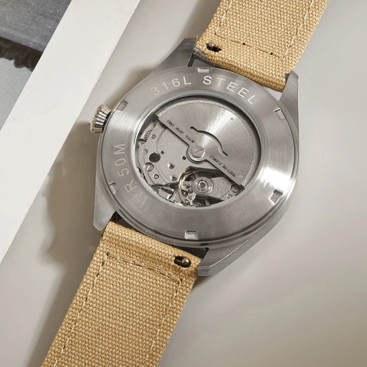 Canvas Khaki Mechanical Watch Flieger Aviator Pilot Steel Wristwatch Arrow WWII German WW2 Automatic Movement Japan Sapphire