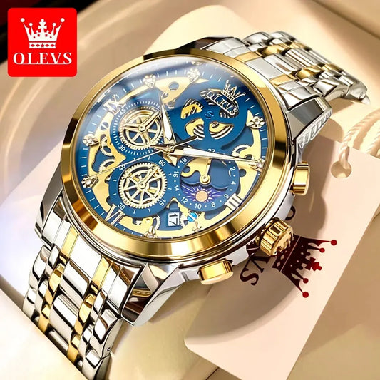 OLEVS Men's Watches Top Brand Luxury Watch for Men Original Waterproof Stainless Steel Chronograph Moon Phase Date Rota Dial