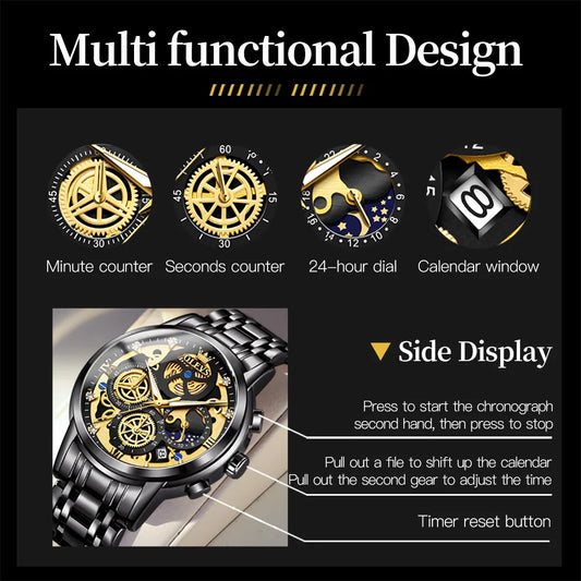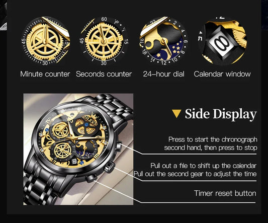 ORLANDO Men Luxury Watches New Arrived Cool Black Gold Quartz Steel Wristwatch Exquisite Masculino Relogio Fashion Clock