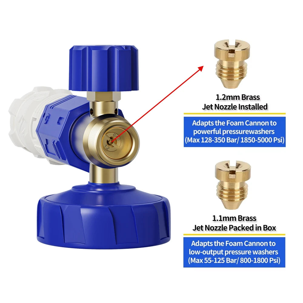 The Foam Cannon with standard 1.2mm nozzle installed is normally for pressure washer between 1850~4000psi. It comes with extra brass nozzle 1.10mm for generating plentiful foam on 800~1850psi electric pressure washers. If you have the household pressure washer, to creating thick foam, please disassemble 1.2mm nozzle from the Foam Cannon with flat screwdriver, and assemble the 1.10mm to your Foam Cannon.