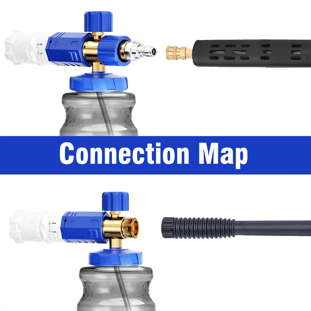 The pressure washer foam cannon made of brass manifold and nylon cover, comes with 32 oz bottle, unique design, fine craft, precision machining, heavy-duty, corrosion-resistant, durable life, can creates thick and dense snow foam to wash your car and vehicles. The foam nozzle can achieve vertical and horizontal spray pattern, variable spray angle from pencil 0° to fan 60°. The bottle at the capacity of 32 oz owns ergonomic easy grip and large opening for easy filling.